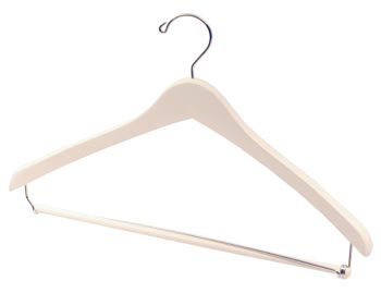 Hanger Store provides premium white clothing hangers with a locking drop pant bar that are great for holding anything from complete suits with a jacket, to shirts, pants, and skirts. These wooden closet hangers come in 10″, 12″, 15″ and 17 in size, made from 1/2 inch thick Natural Hardwood and have a contour design. They fit most mens and womens sized suits, coats, jackets and dress shirts. Currently available in a painted white finish. We also offer Custom White Hangers.